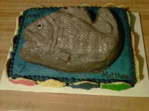 I made a yellow cake and baked it in a plastic fish pan. Then I tinted white chocolate a grayish color and spread it into the same plastic fish mold. I chilled it and carefully turned it over and placed it on top of the baked fish cake. I filled in the spaces with gray tinted buttercream frosting.